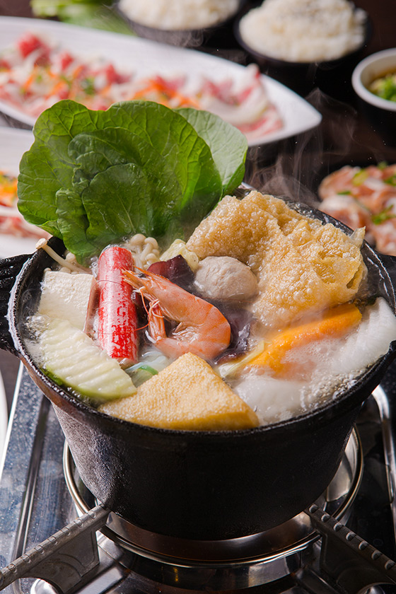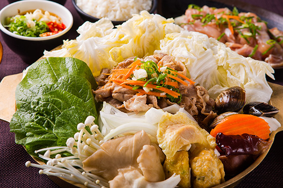 滿滿的火鍋料及蔬菜等豐盛料理環繞在銅盤周圍,在燒烤肉片的同時,周圍的火鍋也同時烹煮著,雙重美味一次擁有!